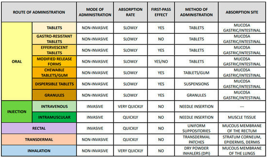 Drug forms such as tablets, capsules, granules, powders, suspensions, solutions, emulsions, inserts, ointments, inserts, aerosols, patches, and transdermal systems affect the drug’s dissolution rate and absorption [51]. Excipients, such as binders, solvents, and stabilizers, can affect a drug’s bioavailability through interactions with the drug or changes in its solubility [52]. Drug release techniques can control the active ingredient’s release rate, which affects its availability and action [48]. Acetylsalicylic acid, commonly known as aspirin, is available in various administration forms. It can be taken orally as tablets in enteral, enteric-coated, effervescent, and controlled-release forms. Additionally, there are also chewable versions, in tablet or gum form, and there is also the possibility of preparing it in a suspension or as granules. The drug can also be administered in uniform rectal suppositories, through injection, by absorption via the skin, or as an inhalation. The effectiveness and action of the drug depend on the selected mode of administration and the form of the drug used (Figure 3) [53,54].