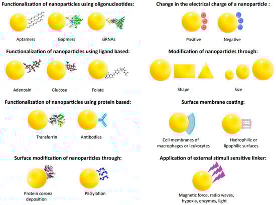 Various ligands, antibodies, aptamers, peptides, or proteins can be used to achieve targeted actions to alter the surface of nanoparticles. Examples of ligands include adenosine, folic acid, and glucose. Adenosine targets nanoparticles to tumor co-cells via the A1 receptor. Folate receptors, overexpressed in some cancers, allow for the selective uptake of nanoparticles. Glucose is used due to the increased demand of cancer cells for this sugar. Ligands exhibit advantages over antibodies, i.e., they are cheaper, simpler to combine, and safer. Ligands can be targeted to specific cell sites, making them more effective. Proteins like transferrin activate cellular receptors. Transferrin possesses more receptors in cancer cells, so it is a suitable ligand for targeted treatment. Nanoparticles with transferrin, such as doxorubicin, show anti-tumor effects and reduce side effects. Nanoparticles of human albumin coated with an antibody against transferrin receptors can carry loperamide across the blood–brain barrier. Aptamers are short RNA or DNA oligonucleotides that bind specifically to proteins or biological targets. They are synthesized by an in vitro process called SELEX. Aptamers are less immunogenic and more accessible to produce than antibodies. Gapmers are short antisense oligonucleotides capable of silencing specific RNA. SiRNA is used for gene silencing, which may have applications in anticancer and antiviral therapy. It is exemplified by liposomes delivering siRNAs that block replication of the SARS-CoV-2 virus. Biofilms and mucus layers can affect the degradation of nanoparticles by trapping them in different pore sizes or through non-specific interactions, which can lead to their removal from the epithelial surface. For this reason, nanoparticles are formed in different sizes and shapes. Given the vital role of the microenvironment for nanoparticles, there is a need to design new types of nanoparticles or to modify them to take advantage of this variability. Exogenous triggers, such as near-infrared light, radio waves, or magnetic fields, allow for the controlled delivery of nanoparticles from the outside. Even surrounding nanoparticles with the membranes of immune cells, such as macrophages or leukocytes, improves their effectiveness in targeted cancer cells. Nanoparticles surrounded by cell membranes show significantly enhanced drug activity compared to free drugs [55,110].
