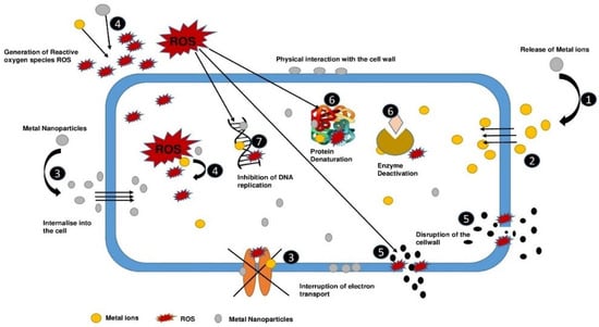 The broad antibacterial mechanisms of metals and metal nanoparticles can be categorized as follows: (1) release of metal ions from metal nanoparticles; (2) direct interaction of metal ions with the cell wall; (3) interaction of metal nanoparticles and the cell wall via electrostatic attraction, which compromises membrane function and nutrient assimilation; (4) ROS generation inside and outside cells; (5) damage caused by oxidative stress to lipids, proteins, and DNA; and (6) substantial amounts of metal binding to the cell envelope along with elevated ROS levels, which can damage the plasma membrane and lead to the leakage of the cell contents. Metal ions and nanoparticles can directly affect DNA and protein functioning upon metal absorption [5,59], which directly affects cellular metabolism and metal-mediated ROS generation.