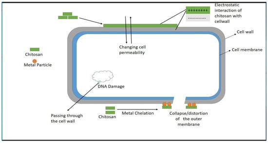 Because of its natural antimicrobial characteristics, extensive sources, and high yield, CS is a preferable antimicrobial material. Its antimicrobial properties are due to its cationic nature. Although the specific mechanism of its antimicrobial action remains unidentified, various hypotheses have been proposed to explain its antimicrobial nature. First, bacterial biofilm splitting, which may be due to the interaction between positively charged CS molecules and negatively charged microbial cell walls, leads to the leakage of the resultant proteins and other cell elements, ultimately resulting in microbial death [46]. Second, chitosan acts as a chelating agent by selectively binding metal proteins and inhibits the formation of toxins and development in microorganisms. Third, chitosan combines with and triggers the cell membrane component, leading to the breakdown of the cell membrane and, ultimately cell death. Fourth, more chitosan and DNA are introduced into the nuclei of microorganisms, and this chitosan in the nuclei inhibits the mRNA and protein activity [13] (Figure 3).