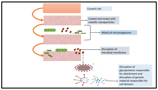 General schematic diagram of antimicrobial mechanism of ceramics [44].
