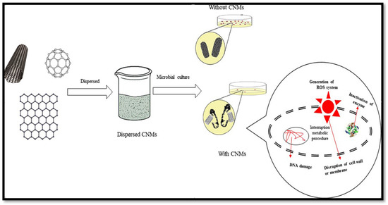 Physical and chemical mechanisms are responsible for the bactericidal action of CNs. As for the physical mechanism, CNs damage the cell wall structure of microbes. Carbon nanomaterials, such as graphene sheets, can biologically isolate microbial cells from their microenvironment, resulting in cell death [102]. Chemical interactions between CN surfaces and microorganisms lead to the formation of harmful chemicals (e.g., ROS) that place cells under oxidative stress. Such an interaction between CNs and microorganisms may result in electron transfer. In this process, electrons are gradually drained from the outer surface of the bacteria, causing non-ROS-induced oxidative stress and then microbial death [103,104] (Figure 5).