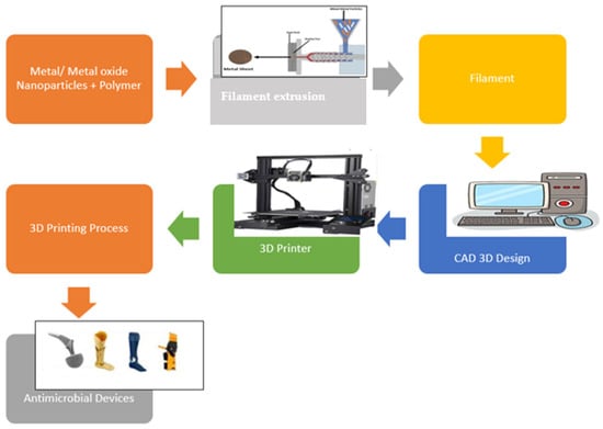 - Ahmed, W.; Al-Marzouqi, A.H.; Nazir, M.H.; Rizvi, T.A.; Zaneldin, E.; Khan, M. Comparative Experimental Investigation of Biodegradable Antimicrobial Polymer-Based Composite Produced by 3D Printing Technology Enriched with Metallic Particles. Int. J. Mol. Sci. 2022, 23, 11235. [Google Scholar] [CrossRef]