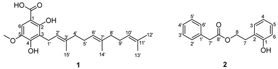 2,4-Dihydroxy-3-farnesyl-5-methoxy benzoic acid (1): white powder; UV (MeOH) λmax (logε): 196 (4.7), 253 (3.9), 310 (3.8) nm; IR (KBr) νmax: 3492, 2925, 1617, 1457, 1236 cm–1; 1H and 13C NMR data see Table 1.