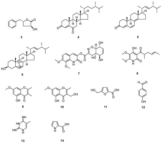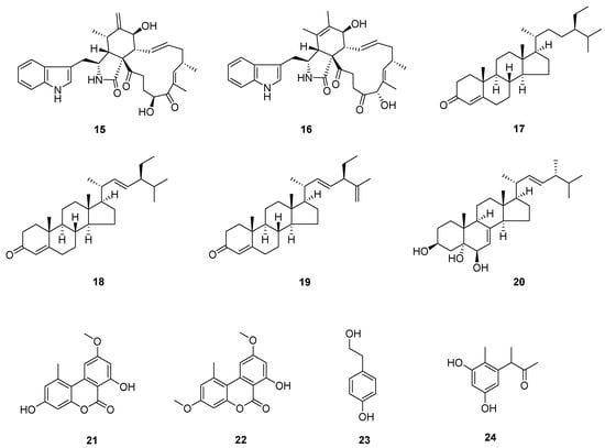 The known compounds (Figure 3 and Figure 4) trans-harzialactone A (3) [7], stigmast-4-ene-3,6-dione (4) [8], ergosta-4,6,8(14),22-tetraen-3-one (5) [9], (22E)-5α,8α-epidioxyergosta-6,22-dien-3β-ol (6) [10], penicillazine (7) [11], harzianopyridone (8) [12], 5-hydroxy-2,3-dimethyl-7-methoxychromone (9) [13], 5-hydroxy-3-hydroxymethyl-2-methyl-7-methoxychromone (10) [13], 5-hydroxymethyl-2-furancarboxylic acid (11) [14], 4-hydroxybenzaldehyde (12) [15], 5-methylpyrimidine-2,4-diamin (13) [16], pyrrole-2-carboxylic acid (14) [16], chaetoglobosin F (15) [17], chaetoglobosin B (16) [18], β-sitostenone (17) [19], (22E, 24S)-stigmasta-4,22-dien-3-one (18) [20], (22E, 24S)-stigmasta-4,22,25-trien-3-one (19) [21], 5β-cholestane-3β,5,6β-triol (20) [22], alternariol 9-methyl ether (21) [23], alternariol 4,10-O-dimethyl ether (22) [24], 4-(2-hydroxyethyl) phenol (23) [25], and 3,3′,5′-dihydroxy-2′-methylphenyl-2-butanone (24) [26] were identified by comparison of their spectral data with the literature values.