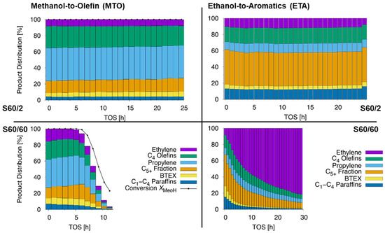 The corresponding ETA conversion results are shown in Figure 4 and Table 3. The feed ethanol is instantly dehydrated to ethylene, a reaction mechanistically separated from the subsequent oligomerization, aromatization, and cracking reactions [23]. Ethylene can thus be considered to be a product of the ETA conversion or the reactant. The authors stick to the latter, but this definition is not uniformly used in the present literature [15,22]. For clarity, no value for the conversion of ethanol will be given in this work. Similar to the MTO conversion, the smaller catalyst S60/2 shows a longer lifetime and no deactivation within 25 h. In contrast, S60/60 shows already initially unconverted ethylene, which equals an incomplete conversion, and a fast deactivation over the first hours. It can thus be clarified that, in agreement with previous findings [42], the primary effect of an increased crystal size is a decreased lifetime for ethanol conversion. This is reasonable, as the deactivation in both reactions is caused by coke formation and pore-clogging. The smaller amount of pore openings for large crystals enables a faster inactivation of pores by coke. The finally reached coke contents in the catalysts are comparable and lie between 7 and 8% of the total mass.