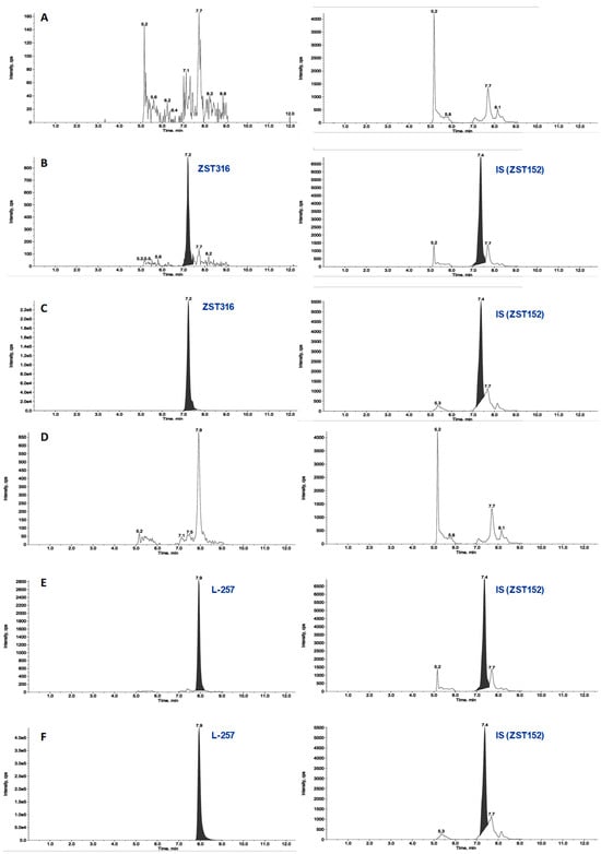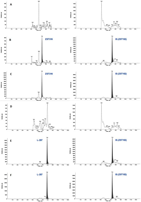 Representative chromatograms of a blank plasma sample (panel (A) for ZST316 and (D) for L-257), LOQ of ZST316 with IS (panel (B)), an unknown study plasma sample analysed for ZST316 (panel (C)), LOQ of L-257 with IS (panel (E)), and an unknown study plasma sample analysed for L-257 (panel (F)). The measured concentration corresponded to 2200 ng/mL and 1710 ng/mL for ZST316 and L-257, respectively.