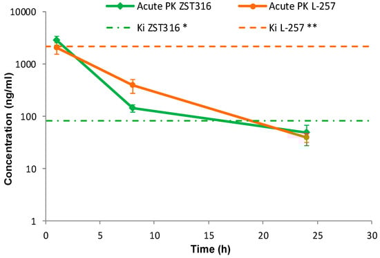 Plasma pharmacokinetics of ZST316 and L-257 after acute administration of ZST316. Dotted lines represent the Ki values (* 261 nM = 80.3 ng/mL; ** 7 μM = 1625 ng/mL; raw data are presented in Supplementary Tables S2 and S3).