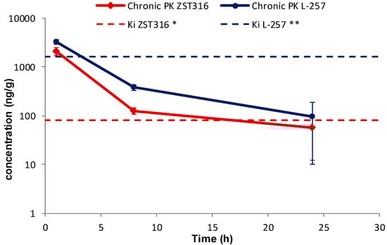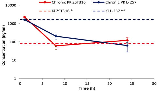 Plasma pharmacokinetics of ZST316 and L-257 after chronic administration of ZST316. Dotted lines represent the Ki values (* 261 nM = 80.3 ng/mL; ** 7 μM = 1625 ng/mL; raw data presented in Supplementary Tables S6 and S7).