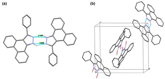 X-ray crystal structure of compound 2a. Carbon atoms are shown in gray, nitrogen atoms in purple, and N-H hydrogen atoms in white. The hydrogen atoms on the benzene rings are omitted for clarity. (a) View face-on to the aromatic rings showing the hydrogen bonds in the 2a dimer. Annotated with the NH–N hydrogen bonds’ length and N-N distance. (b) View of a unit cell. The blue lines show the NH–N hydrogen bonds in the 2a dimer. The red lines show the NH–N hydrogen bonds between 2a and another omitted molecule.