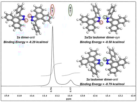 The calculation results of the binding energies of two types of dimeric species of 2a in DMSO-d6. The calculations were performed using the Gaussian 09 program at a B3LYP-D3(BJ)/ma-TZVP level. The blue dashed lines show the NH–N hydrogen bonds. The red circles show N-H hydrogen atoms and peak of 2a, when green circles show that of 2a tautomer.