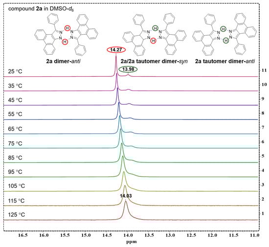 A temperature gradient experiment of compound 2a in DMSO-d6 was performed from 25 °C to 125 °C; the corresponding 1H NMR spectra are recorded in Figure 3. With the temperature increasing, it is shown that two 1H sharp signals gradually coalesced into a unique, broad signal at 14.03 ppm at 125 °C, which results from the fast chemical exchange of 2a and 2a tautomer at relatively higher temperature.