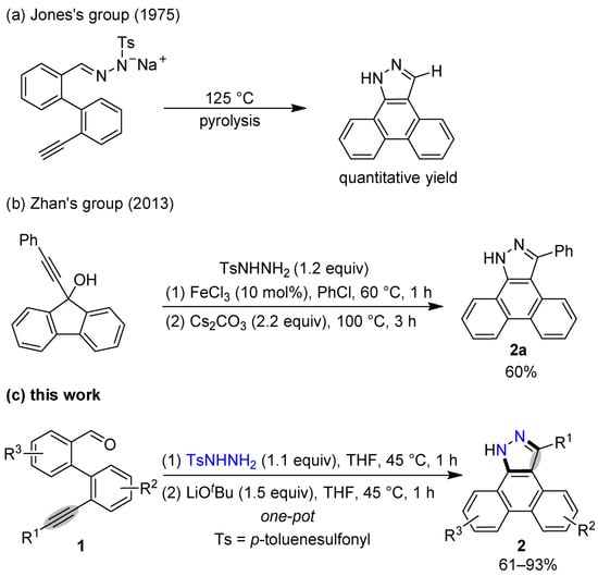 In 1975, Jones’s group reported a pyrolytic method towards 1H-dibenzo[e,g]indazole from 2′-ethynyl-biaryl-2-aldehyde N-tosylhydrazone sodium-salt in a quantitative yield [29] (Scheme 1a). In 2013, Zhan’s group synthesized 3-phenyl-substituted 1H-dibenzo[e,g]indazole (2a) in a 60% yield from a ring-expansion strategy of 9-(phenylethynyl)-9H-fluoren-9-ol [30] (Scheme 1b). We note that only one example was given in each of the cited references, and either high temperatures or complicated starting materials were required.