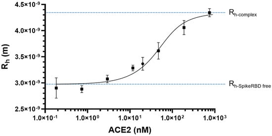 Microfluidic diffusional sizing determination of KD for the spike RBD (20 nM)/ACE2 complex (DMSO, 1% v/v; room t°). Rh as a function of ACE2 concentration. ACE2, 180 pM to 750 nM; spike RBD, 20 nM; mean ± standard deviation (n = 4).