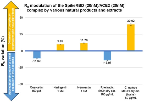 Rh modulation of the spike RBD (20 nM)/ACE2 (20 nM) complex by various natural products and extracts. Rh variation (%) of the spike RBD/ACE2 complex as a function of the tested natural products and extracts. Microfluidic diffusional size. Mean ± standard deviation. n = 3.