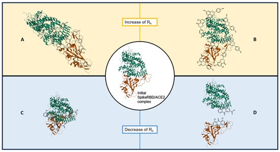 Schematic view of possible 3D conformational changes that the spike RBD/ACE2 complex could adopt in the presence of natural compounds, with their influence on Rh. The initial conformation of the spike RBD/ACE2 complex is represented in the center (PDB 6M0J); SARS-CoV-2 spike RBD is depicted in orange and ACE2 in green. (A) An increase in Rh could be due to distension of the complex; (B) An increase in Rh could be due to clustering of natural compounds on proteins; (C) A decrease in Rh could be due to collapse or folding of the complex; (D) A decrease in Rh could be due to (partial) separation of the 2 proteins.