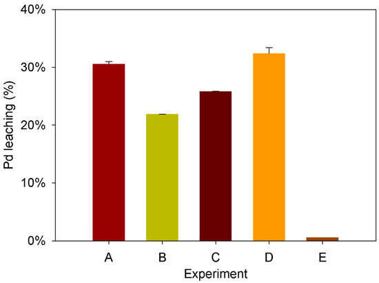 Percentage of palladium leached in the different experiments from the single-variable impact analysis. A–E represent different experimental conditions, as listed in Table 2.