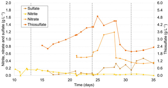 In an attempt to mitigate the observed decline, the introduction of oxygen into the bioreactor was ceased (Stage V). This intervention was implemented to curb the oxidation of accumulating thiosulfate to sulfate, which went from 0.006 g SO42− L−1 on day 24 to 0.333 g SO42− L−1 on day 35 as depicted in Figure 2. This correlation also gives support to the hypothesis that thiosulfate has been employed by the bacterial consortium as an energy source once the bioreactor started to operate in batch mode. Unfortunately, the outcomes of this intervention proved to be unsatisfactory, as they failed to elevate the thiosulfate concentration in the bioreactor, which reached 2.1 ± 0.17 g S2O32− L−1, even following an extended period of 10 days.