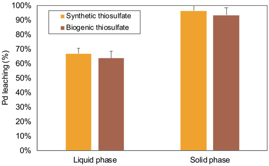 The leaching of Pd using biologically produced thiosulfate achieved a recovery rate in the liquid phase of 63.53 ± 0.07% (Figure 3). In summary, the comparison of biogenic thiosulfate and synthetic thiosulfate described in the present study revealed nuanced differences in their impacts on the precious metal recovery process. These results underscore the promising potential of biogenic thiosulfate as an effective agent for the recovery of precious metals, emphasizing its role in sustainable and environmentally friendly metal extraction processes.