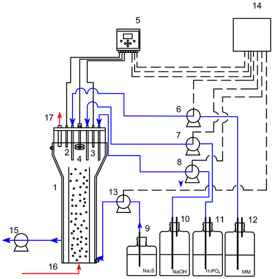Inner loop jacketed gas-lift bioreactor scheme. 1: Gas-lift bioreactor; 2: pH probe; 3: ORP probe; 4: sensor level; 5: Multimeter; 6: Analog peristaltic pump; 7: H3PO4 peristaltic pump; 8: NaOH peristaltic pump; 9: Na2S container; 10: NaOH container; 11: H3PO4 container; 12: Mineral medium container; 13: Na2S peristaltic pump; 14: PC and control system; 15: Discharge peristaltic pump; 16: Gas flow inlet; 17: Gas flow outlet. Red arrows stand for gaseous streams while blue arrows represent liquid streams.