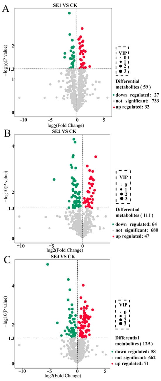 Volcano plot of differential metabolites in Lycium barbarum fruit samples ((A): sodium selenite (SE1), (B): nano-selenium (SE2), and (C): organic selenium (SE3), versus sprayed water control (CK)).