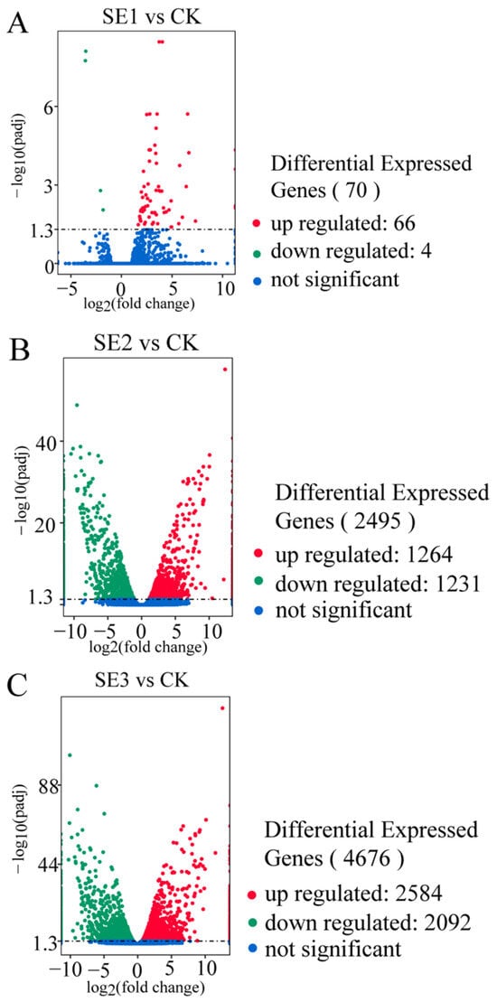 Volcano map of differentially expressed genes in Lycium barbarum samples ((A): sodium selenite (SE1), (B): nano-selenium (SE2), and (C): organic selenium (SE3), versus sprayed water control (CK)).