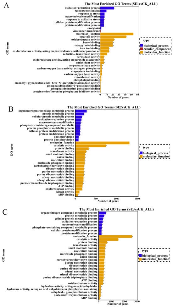 GO enrichment bar chart of differentially expressed genes in Lycium barbarum samples: ((A): sodium selenite (SE1), (B): nano-selenium (SE2), and (C): organic selenium (SE3), versus sprayed water control (CK)).