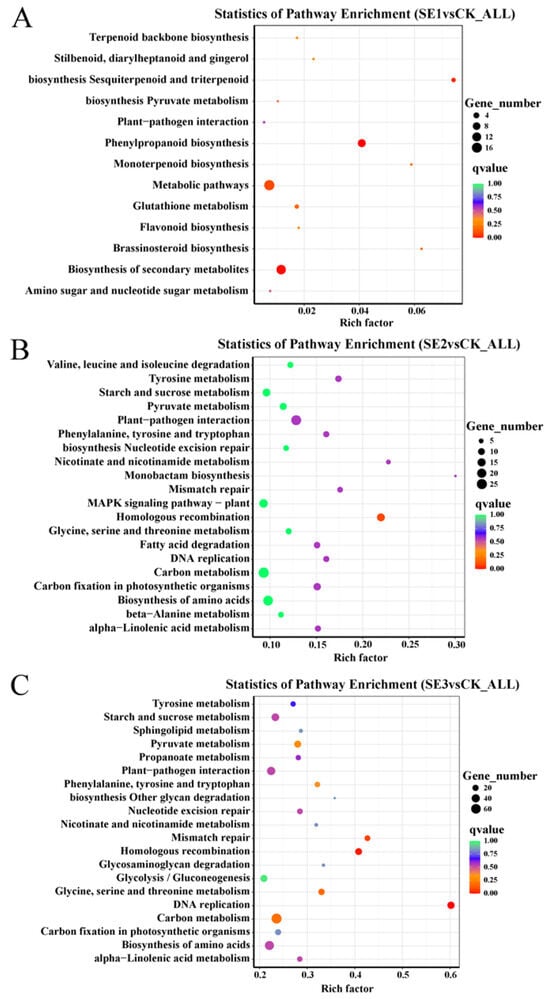 Analysis of KEGG pathways for differential genes in Lycium barbarum samples: (A): sodium selenite (SE1), (B): nano-selenium (SE2), and (C): organic selenium (SE3), versus sprayed water control (CK).