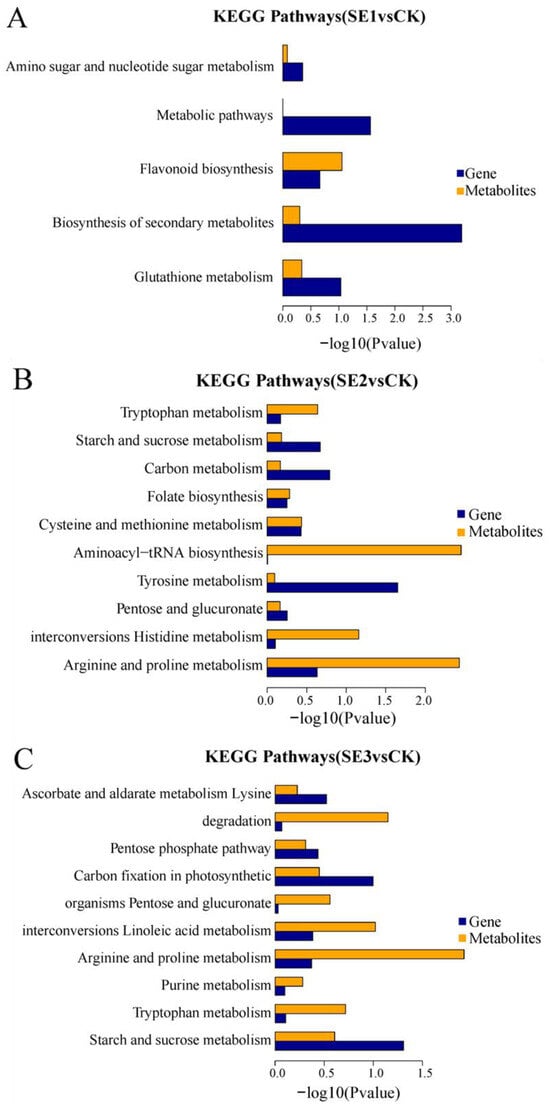 KEGG enrichment histogram of differential metabolites and differential genes in Lycium barbarum samples. (A): sodium selenite (SE1), (B): nano-selenium (SE2), and (C): organic selenium (SE3), versus sprayed water control (CK).