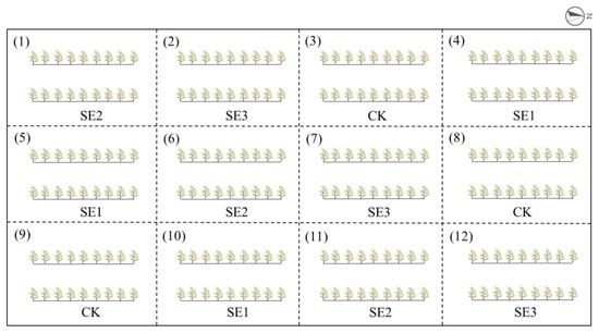 A total of 216 7-year-old L. barbarum plants were utilized for this research, as demonstrated in Figure 6. The plants were allocated within 12 experimental areas, consisting of four distinct treatments: sprayed water (CK), sodium selenite (SE1), nano-selenium (SE2), and organic selenium (SE3). Each treatment comprised two rows containing a total of 18 plants. The experiment was conducted using a completely randomized block design, which was replicated three times.