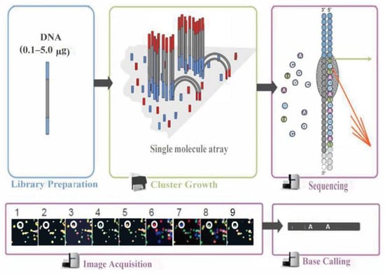 The Illumina sequencing principle schematic is shown in Figure 7. During this process, after the library is qualified, it is pooled according to its effective concentration and the desired data volume, and finally, the corresponding model of the sequencer is selected for online sequencing according to the sequencing read length. The basic principle of this type of sequencing is sequencing by synthesis. Four types of fluorescently labeled dNTP, DNA polymerase, and junction primers are added to the sequencing flow cell for amplification. When extending the complementary strand of each sequencing cluster, each fluorescently labeled dNTP that is added releases a corresponding fluorescence. The sequencer captures the fluorescence signals and converts the light signals into sequencing peaks through computer software, thus obtaining the sequence information of the fragment to be tested.