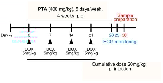 A schematic illustration of the establishment of a mouse model doxorubicin (DOX)-induced cardiotoxicity (DICT). Male C57BL/6 mice received four separated doses of 5 mg/kg DOX via intraperitoneal (i.p) injection at day (D) 0, D7, D14, and D21, over three weeks, resulting in a cumulative dose of 20 mg/kg of DOX. Additionally, 400 mg/kg of PTA or berberine (Ber, positive control) was orally administrated (p.o) to the mice for four weeks. An electrocardiogram was taken 1 week after DOX withdrawal, using a non-invasive method, followed by the collection of blood and cardiac tissue samples a day later.