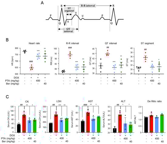 All the animal experiments were adherent to the International Animal Care Protocols and were approved by the Korea Food Research Institute (IACUC Approval No. KFRI-M-22004). Eight-week-old C57BL/6 mice were acclimatized for one week before the experiment and randomly divided into four groups (n = 3 or 4/group). The mice were kept in a controlled environment (humidity: 40–60%; temperature: 23 ± 2 °C) following a 12 h light/dark cycle. To induce cardiotoxicity, mice received intraperitoneal injections of 5 mg/kg DOX for 4 weeks, resulting in a cumulative dose of 20 mg/kg. PTA (400 mg/kg) and berberine (40 mg/kg) were orally administered five days a week, with berberine serving as the positive control. Electrocardiograms (ECG) were analyzed using EzCG Analysis Software (BIOPAC Systems Inc., Goleta, CA, USA) two days before sacrifice. Blood and cardiac tissues were collected from the mice to evaluate DOX-induced cardiac injury.
