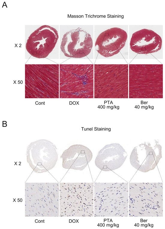 Further analysis showed that the protective effects of PTA against DOX-induced cardiac damage were attributable to the inhibition of collagen accumulation within myocardial cells, leading to the prevention of apoptotic cell death. MTS assay showed that DOX administration elevated collagen accumulation in myocardial cells in vivo, which was effectively suppressed and reversed by the PTA treatment (Figure 4A). Moreover, the TUNEL assay indicated that PTA treatment significantly suppressed DICT-induced apoptotic cell death in cardiomyocytes (Figure 4B). Collectively, these results suggest that PTA inhibits the progression of cardiac fibrosis by reducing DICT-induced collagen accumulation within cardiomyocytes, leading to decreased cardiomyocyte apoptosis.