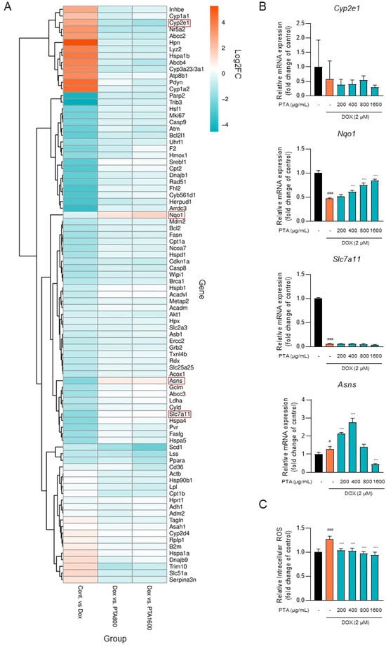 To investigate the potential therapeutic mechanisms of PTA in DICT, we used a PCR microarray to identify the toxicological pathways affected by PTA. Specifically, we examined the mRNA expression of 89 genes and found that PTA treatment significantly reversed DOX-induced upregulation or downregulation of some genes compared with that in the control group (Figure 5A). Among these genes, Cyp2e1, Nqo1, Slc7a11, and Asns are involved in DICT-related hypertrophy [28], anti-oxidation [29], and ferroptosis [30]. Therefore, we validated the mRNA levels of Cyp2e1, Nqo1, Slc7a11, and Asns in H9c2 cells using qRT-PCR. Among the genes, Nqo1 expression, which was decreased by DOX administration, was restored by the PTA treatment. In contrast, while Slc7a11 expression was also decreased by DOX treatment, it did not show restoration with PTA treatment. Cyp2e1 expression was not significantly altered by DOX treatment. Asns expression was slightly upregulated by DOX treatment. The PTA treatment further upregulated Asns expression until reaching 400 µg/mL and downregulated it at 1600 µg/mL compared to the DOX-treated group without the PTA treatment (Figure 5B). The NQO1 enzyme, encoded by the Nqo1 gene, is an antioxidant enzyme, and its induction has been associated with a decreased susceptibility to oxidative stress [10]. Moreover, the PTA treatment significantly suppressed DOX-induced intracellular ROS generation in H9c2 cells (Figure 5C). Overall, these results suggest that PTA ameliorates DICT by inhibiting ROS generation through the upregulation of Nqo1 expression.