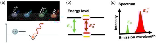 Significant progress has been made recently. It has been found that precise control of the chemical functionalization, by introducing O dopants into the sp2 lattice of tube walls or intentionally synthesizing sp3 defects (see Figure 1a) [,], enables the fine-tuning of the local energy level within the semiconducting SWCNTs (s-SWCNTs). S-SWCNTs, being a direct bandgap semiconductor with luminescent properties and a characteristic 1D quantum system, transform defects—from traditional nuisances in crystalline substrates to pivotal molecular focal point for regulating electrons, excitons [], phonons, and spins. As elucidated in Figure 1, the engineered defect site constitutes a quantum well capable of trapping excitons, emitting bright photons in the near-infrared (NIR) region and serves as a room-temperature single-photon source. Consequently, such defect sites have been conferred the designation of fluorescent quantum defects or organic color centers (OCCs). The spectral emission of certain OCCs, as illustrated in Figure 1b,c, is affected by both the depth of the potential well and the original bandgap of the s-SWCNT, and thus is completely tunable by the combination of grafted moiety and the chirality of the s-SWCNT [].