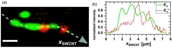 PL images of individual functionalized SWCNT. (a) Image of the pristine emission (green) and defect emission (red). Scale bar equals 1 μm. Corresponding intensity profiles captured along the SWCNT axis (XSWCNT) delineated by white dashed lines in (a) and presented in (b), revealing an inverse relationship between green and red signal. Reproduced with permission []. Copyright 2015, The Royal Society of Chemistry.