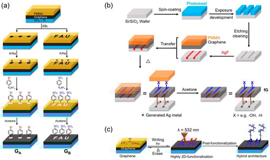 Procedures for molecular patterning on graphene. (a) General strategy for selective functionalization on SLG. The dark spots and “FAU” insignia indicate areas of uncovered graphene, whereas other sections are protected by orange PMMA. PMMA is removable with acetone, revealing functional groups attached (highlighted in white) to form GA and GB structures. Reproduced with permission []. Copyright 2020, Wiley-VCH. (b) Realization of the bottom-side patterning of SLG using site-selective fluorination. Reproduced with permission []. Copyright 2020, Wiley-VCH. (c) Direct laser writing enabling site-specific, photolytic attachment of functional moieties and silver nanoparticle patterning. Reproduced with permission []. Copyright 2020, ACS.