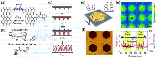 In another interesting attempt (see Figure 5a), cyclopentadienes (CPs) tagged with Raman and electrochemically active moieties (Figure 5b) were covalently grafted onto graphene surfaces using a force-driven Diels−Alder (DA) reaction. This reaction was facilitated by an elastomeric tip array affixed to piezoelectric actuators within an atomic force microscope setup (Figure 5c) []. Cycloaddition reactions, characterized by their negative activation volumes, experience pronounced acceleration under applied pressure. These tip arrays, integral to polymer pen lithography [,,], produce precise patterns through the transfer of ink from tips to substrate via an aqueous meniscus. The expansive patterning area (>1 cm2) and controlled piezo-actuator movement enable high-throughput and intricate pattern customization. Using Raman-active cyanine and electrochemically active ferrocene CPs, the covalent linkage between the SLG and CPs was investigated via Raman microscopy, cyclic voltammetry, and electronic structure calculations, confirming the presence of micrometer-scale, covalently patterned motifs across large areas. Notably, these reactions proceed under ambient conditions, exploiting a canonical organic transformation, and preserve graphene’s electrical properties, making this method applicable for advanced sensing, electronic, and optical devices.