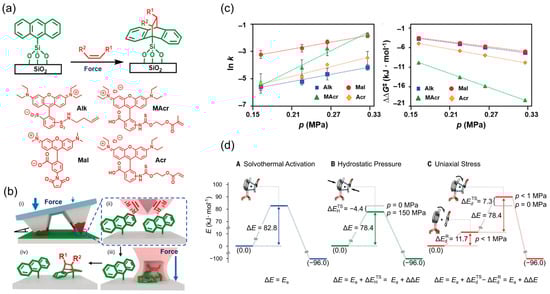 Force-induced DA reactions on anthracene monolayer. (a) Schematic of DA cycloaddition between anthracene and dienophiles under mechanical force. Illustrated structures of dienophiles Alk, Mal, MAcr, and Acr. (b) The process of elastomeric tip arrays applying a dienophile and PEG ink (red) to an anthracene-coated surface under forces): (i) ink transfer at varying angles; (ii) creating areas of differential force—marked by thick arrows for high force and thin arrows for low force; (iii) these regions act as nanoreactors and increase the speed of DA cycloaddition reactions under applied force; (iv) post-rinse, only the molecules covalently bonded remain. (c) Reaction activation parameters on anthracene monolayers, featuring ln(reaction rate) and the change in free energy of activation vs. force for four dienophiles. (d) Comparative potential energy profiles under pure solvothermal conditions, hydrostatic pressure, and uniaxial mechanochemical stress. Reproduced with permission []. Copyright 2023, AAAS.
