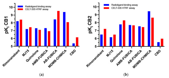 Since none of the compounds exhibited a difference greater than 1 between the pKi values obtained in the two different experiments (radioligand binding and Tag-lite® binding), as depicted in Figure 8, the validation of CELT-335 in Tag-lite® competition binding assays was deemed successful. A broader range of reference compounds will be screened for further validation, including known screening chemical libraries composed of compounds with diverse chemical structures and targets beyond CBRs.