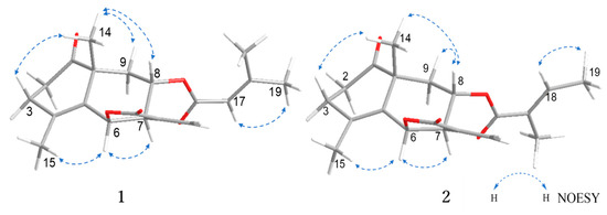 | 13 | 5.90 (d, 2.0) 6.34 (d, 2.0) | 125.8 | 5.91 (d, 2.0) 6.35 (d, 2.0) | 125.8 | 5.70 (d, 1.1) 6.26 (d, 1.1) | 129.3 | 5.69 (d, 1.1) 6.27 (d, 1.1) | 129.5 |