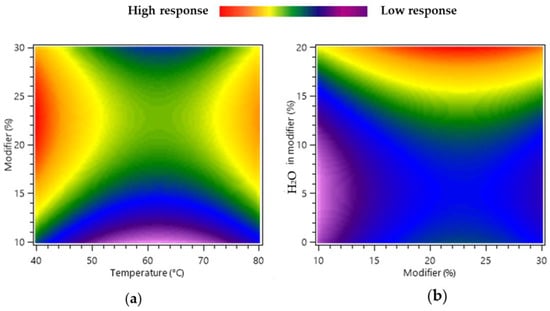 Response surface heat-maps showing the effects of the variation of experimental design factors on the total compounds of interest yield (mg/g) from pomegranate pericarp. (a) Interaction between temperature (X1) and total modifier percentage (X2) and (b) interaction between total modifier percentage (X2) and H2O % in modifier (X3).