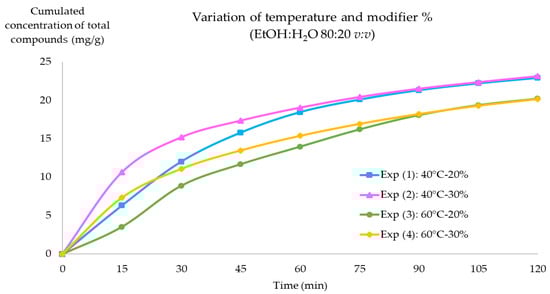 These results validated the calculated optimal temperature to extract Punica granatum L. pericarp compounds, where the extractions conducted at 40 °C had a superior yield coMPared to higher temperatures (60 °C). In addition, even though exp n°2 had the fastest extraction rate in the first 45 min, after 60 min, exp n°1 had a similar yield with the use of lower amount of modifier. Therefore, the optimal extraction condition selected was exp n°2 with 40 °C and 20% of modifier for 60 min. This extraction condition allowed for the recovery of 18.46 mg/g of compounds of interest from pomegranate pericarp. It was noted that a two-hour extraction resulted in a higher extraction yield of 22.91 mg/g. The second 60 min, however, produced a 24.10% yield increase while consuming twice as many resources. Therefore, 60 min could be sufficient under these conditions to reduce energy and resource consumption, with 40 °C and 20% EtOH:H2O 80:20 v:v.