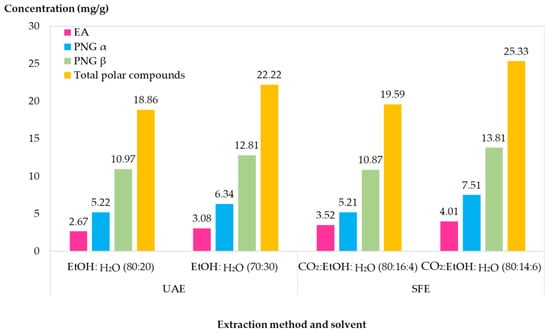 This indicated that the use of higher H2O percentage in the extraction solvent was beneficial for the recovery of pomegranate pericarp polar compounds. Moreover, the experiments performed with SFE exhibited the same behavior as UAE with increase of the of H2O percentage. The SC-CO2 extraction conducted with a modifier composition of EtOH:H2O 70:30 v:v when coMPared to 80:20 v:v, allowed for a yield increase for EA, PNGα, and PNGβ of 13.92%, 44.14%, and 27.05% respectively.