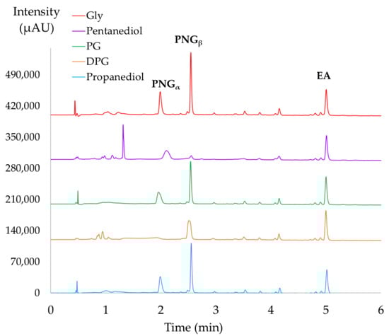 The extracts were showing a homogenous and stable aspect with these cosmetically approved solvents: dipropylene glycol (DPG), propylene glycol (PG), glycerol (Gly), 1,3-propanediol, and pentanediol. The results of UHPLC-DAD analysis of PPE dissolved are presented in Figure 4. Evidently, the EA peak shape was not affected since it was eluted later in the gradient and was independent from the viscosity of the injection solvent. However, the peak shape of PNGs was strongly influenced when using pentanediol and DPG. Moreover, the use of PG influenced the symmetry of PNGα. Hence, Gly and propanediol were the only solvents that did not influence the analysis and quantification of PNGs. Lastly, Gly was selected for the stabilization of PPE because of the slight improvement of the peak high, possibly due to enhanced solubility of the studied compounds and the lower price point when compared to propanediol.