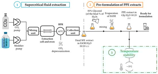 The integrated process for SFE extraction of Punica granatum L. pericarp is composed of two main steps, illustrated in Figure 5. The first step is the supercritical fluid extraction of the plant mass using a mixture of SC-CO2 and modifier as extraction solvent. As described previously, the optimized extraction conditions (EtOH:H2O 80:20 v:v) were employed to limit the H2O % to 20% of the final extract. After the back-pressure regulator (BPR), the CO2 depressurizes and returns to its gaseous state and the final SFE extract is collected in the modifier. The second step included the pre-formulation of the SFE extract in a Gly:H2O 80:20 v:v this composition allowed the stabilization of the extracts while keeping only 20% of H2O, minimizing the influence of water on the stability of the extracts. To achieve this composition, a volume of Gly equal to EtOH was added to the final SFE extract, representing 80% of the final collected volume. Then, the mixtures of EtOH:Gly:H2O were mixed manually to achieve a homogenous mixture. The following step included the evaporation of EtOH using nitrogen flow. The evaporation of EtOH first and then adding Gly after to the extract in water was tested. However, the PPE was not fully stable in only water, and this eventually led to its precipitation and later needed centrifugation, adding a unit operation to the post-treatment process. Moreover, the direct addition of glycerol (5%) mixed with ethanol in the modifier during the extraction step was tested and did not achieve a high extraction yield of targeted compounds. Therefore, Gly was added directly to the SFE extract and EtOH was later evaporated. Finally, after this step, the pomegranate extract was solubilized in a Gly:H2O 80:20 v:v mixture, pre-formulated to be included in cosmetic emulsions of formulas.