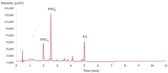 UHPLC-DAD analysis of polar extracts of Punica granatum L. pericarp diluted in DMSO:EtOH:H2O at 366 nm. PNG α (RT = 1.83 min), PNG β (RT = 2.45 min), and EA (RT = 4.88 min).