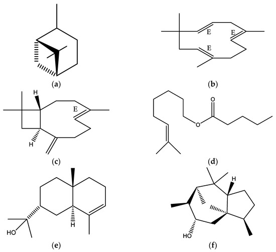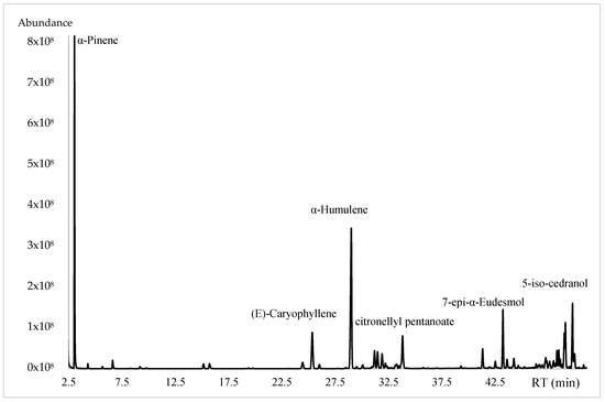 From the data obtained, the EO showed a complex mixture of several components, predominated by hydrocarbon sesquiterpenes (37.43%) followed by oxygenated sesquiterpenes (31.08%), hydrocarbon monoterpenes (24.14%) and to a lesser extent oxygenated monoterpene (0.20%). Furthermore, the major compounds were (a) α-pinene (22.70%), (b) α-humulene (17.20%), (c) (E)-caryophyllene (6.02%), (d) citronellyl pentanoate (5.76%), (e) 7-epi-α-eudesmol (4.34%) and (f) 5-iso-cedranol (3.64%), as shown in Figure 1 and Figure 2.