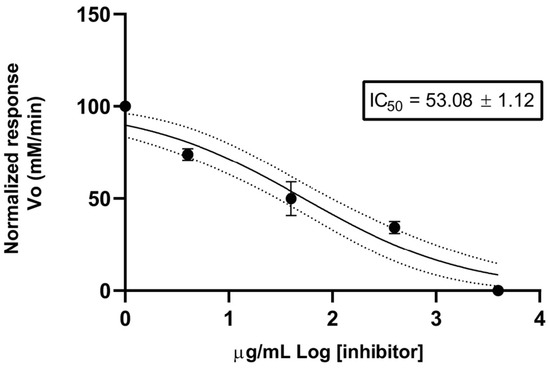 The AChE inhibitory activity of E. valvata EO was assessed using a spectrophotometric method. The E. valvata EO was assayed for its anticholinesterase potential by measuring the rate against three different concentrations; it showed a moderate inhibitory activity with an IC50 value of 53.08 ± 1.13 µg/mL (Figure 3). Furthermore, donepezil hydrochloride was used as a positive control with an IC50 value of 12.3 ± 1.35 µg/mL.